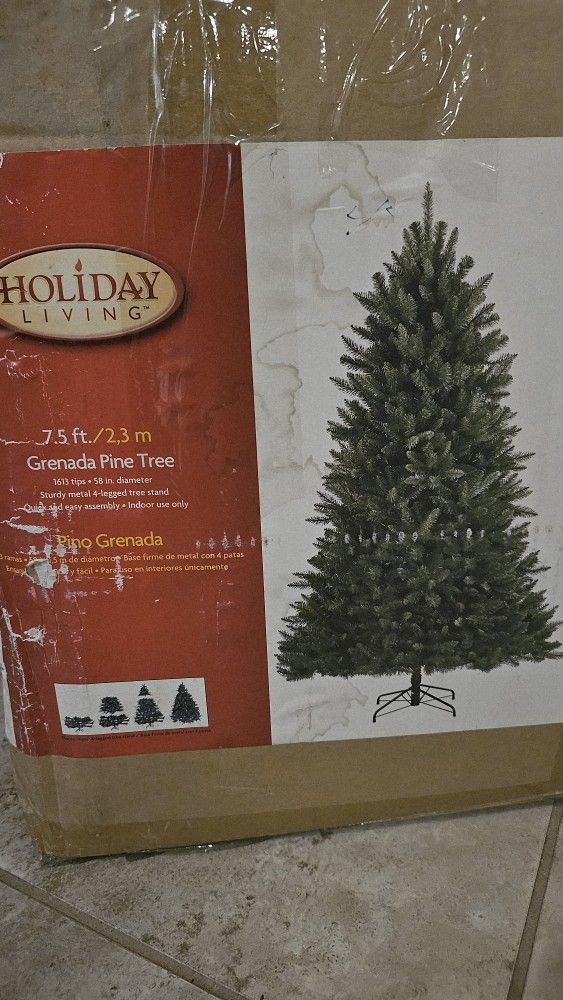 Great condition 7.5 ft Grenada Pine Tree with sturdy metal 4-legged tree stand. Has 1613 tips and 58 in. diameter. Quick and easy assembly, for indoor use only. Well kept and stored on it original box
