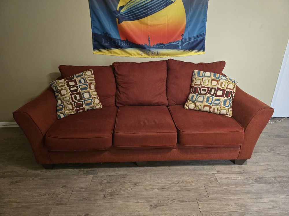Three seat red couch with two throw pillows. All the seat and backrest covers are removable and washable. Has some cat scratches shown in photos.