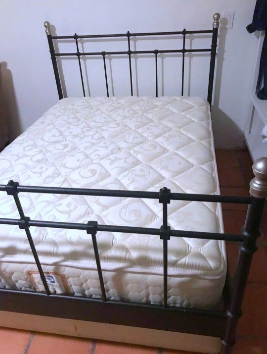 Excellent quality / excellent condition. Full / double size. Mattress very comfortable with a medium feel between soft and firm and it's an innerspring mattress, not just foam, actually has Titanium innersprings which are a lot better than regular steel springs. Bed frame is solid black/dark brown metal and comes complete with all its parts (no screws or tools necessary as it all simply hooks together). And it's actually the frame shown in the last 2 pics, not the frame shown in the first pics. Asking $200 for the whole set. And delivery available for $60.