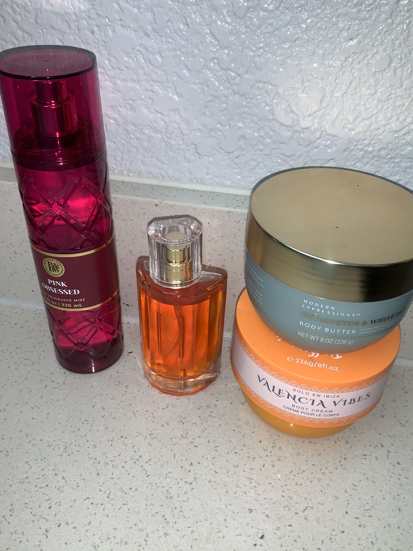 $25 for all four pink obsession brand new chocolate musk perfume brand new body butter gray color new eucalyptus —yellow body butter smell like Brazilian bum bum Cream ✅✅✅✅