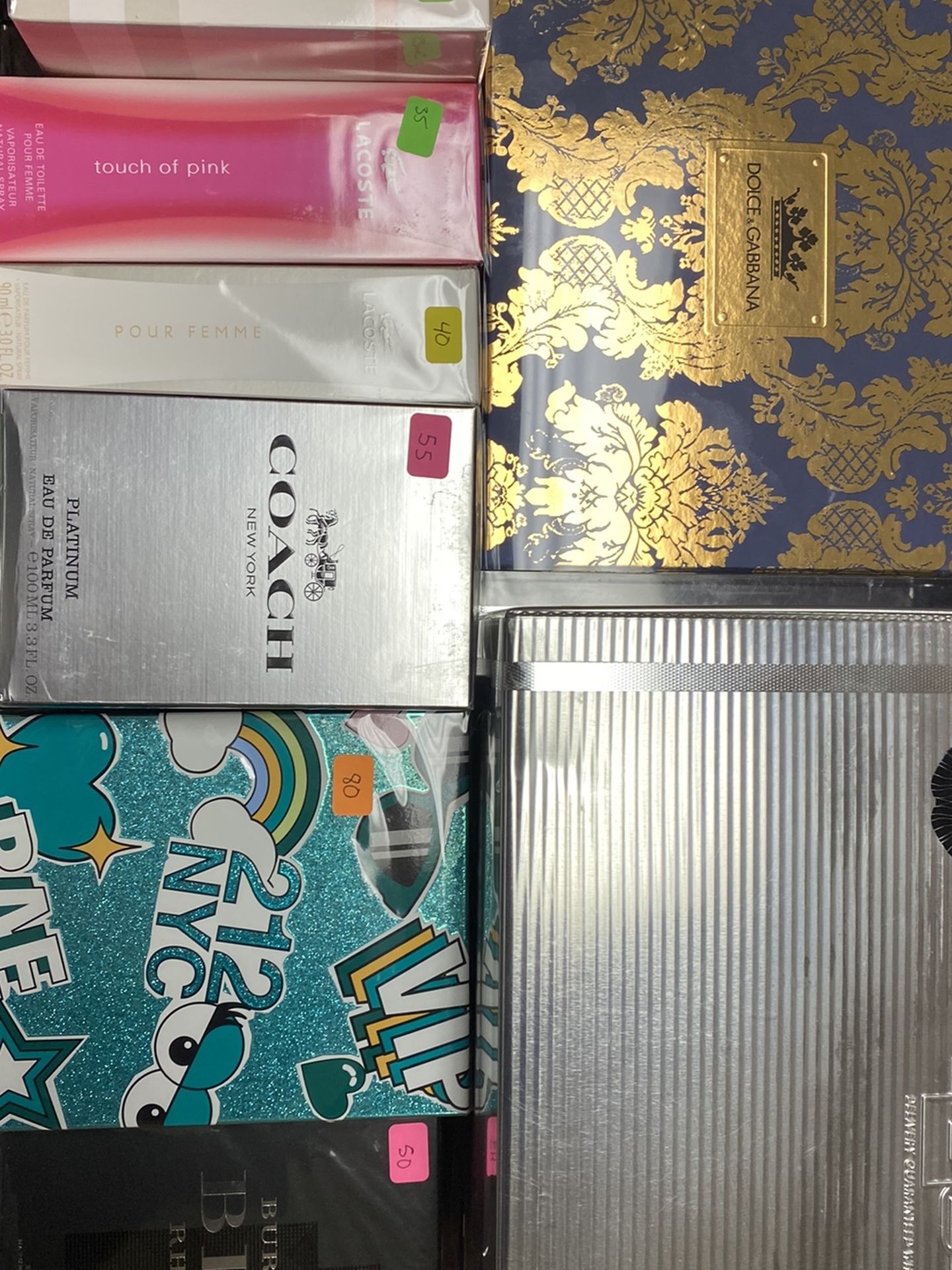 Tons of high end branded colognes and perfumes for men and women. All are real ask for prices, and any you would like !