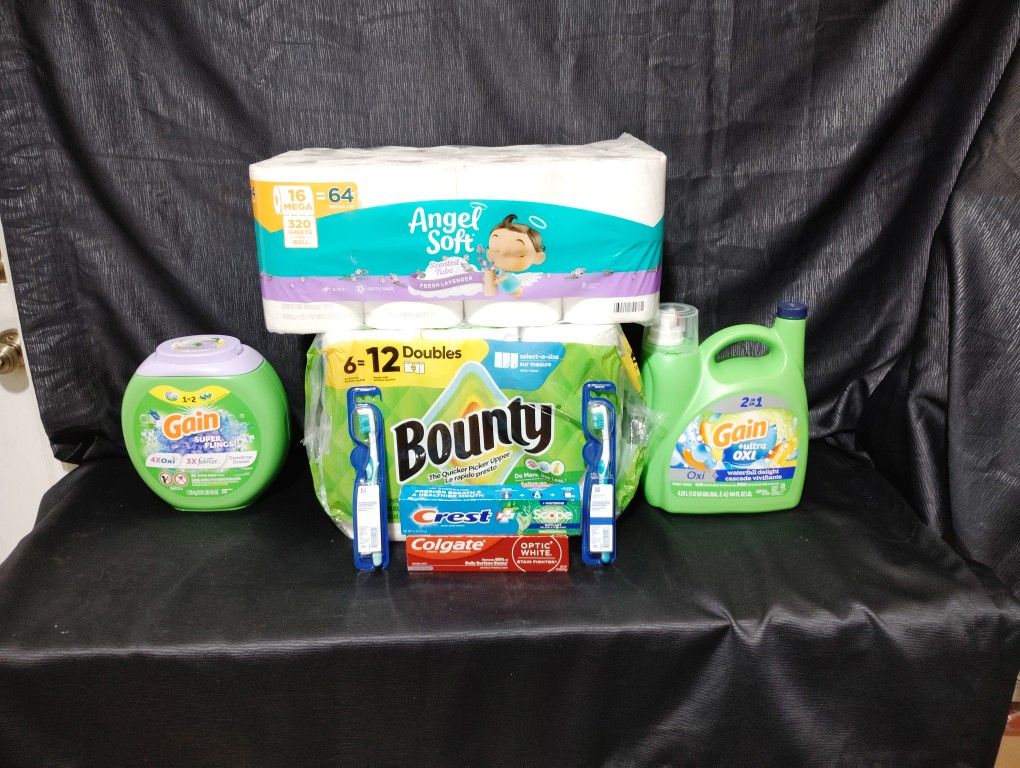 8 Items for your home 8 Productos para tu hogar. 1 Gain Super Flings Bolitas 32 1 pack of Angel Soft Papel higienico 16 Rollos 1 pack de Bounty Papel toalla 12 1 Gain detergent 144 oz 2 toothpaste pasta de dientes Crest 5.4oz. Colgate 6.0oz 2 Toothbrush cepillos de dientes