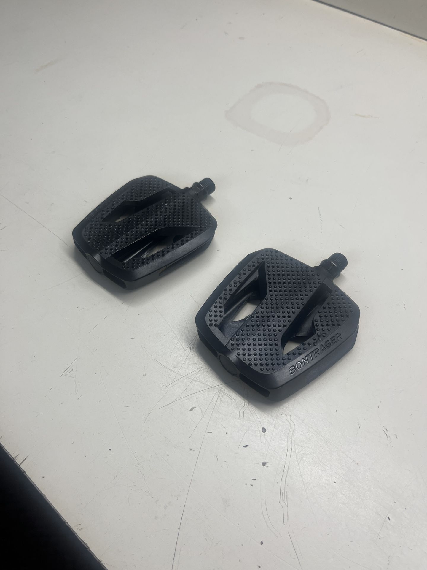 Taken off a Trek Verve 2 Gen 5 hybrid bike after one week from purchase Like new with little to no imperfections Trek Bontrager City Pedals The Bontrager City Pedal Set delivers comfortable foot support and reliable traction to keep you confidently connected to your bike. It features reflective edges on the front and rear to add visibility in low-light conditions, and a strong, durable, and easily serviceable chromoly axle to keep you rolling smoothly ride after ride. - Nylon concave body supports and stabilizes foot while pedaling - Anti-slip texture for traction and confidence - Front and rear reflective panels add visibility in low-light conditions - Durable chromoly spindle with long- lasting, serviceable bearings - Installs with 6mm hex key or flat 15mm pedal wrench Technical Specs Color: Black Threading: 9/16” (15mm) Pedal Size: 4in W x 3.75in L x .75in H Pedal Design: Flat Pedal Body Material: Composite Pedal Spindle Material: Steel Material(s): Nylon Bearing Material: Stainless Steel Weight: 343g (pair) UPC: (contact info removed)93 MPN: (contact info removed) MSRP: $33
