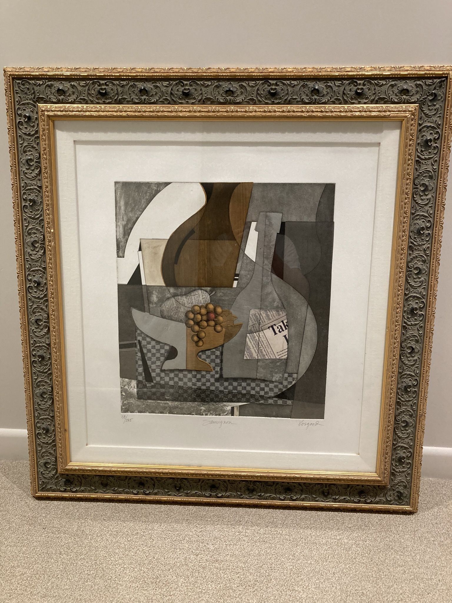 Beautifully framed art print titled “Sauvignon” signed by “Kosgood” and numbered 59/275. It measures 35” wide x 37” tall. It is framed in antiqued gold with matte black trim in between. Delicate design pattern on the framing and the print trimmed with cloth matting. It has a mid century flair to it. General, painting, wall art, household decor, furniture, wall hanging, artwork, painting