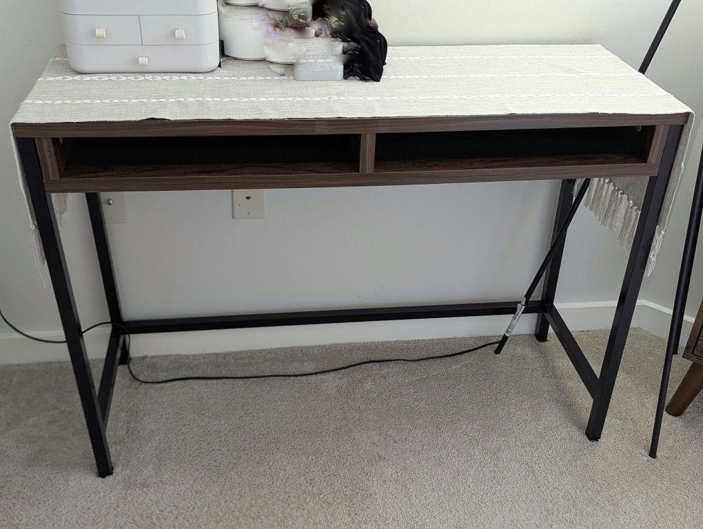 Mainstays Sumpter Park Desk, Canyon Walnut Rich Canyon Walnut finish with simple black metal frame and legs Features two open shelving compartments A stylish, modern look complements virtually any room decor beautifully Desktop can support up to 95 lbs, shelves can support up to 44 lbs Dimensions: 43.58" L x 15.35" W x 30.79" H Weight: 27.83 lbs Materials: MDF, particleboard, iron, paperboard