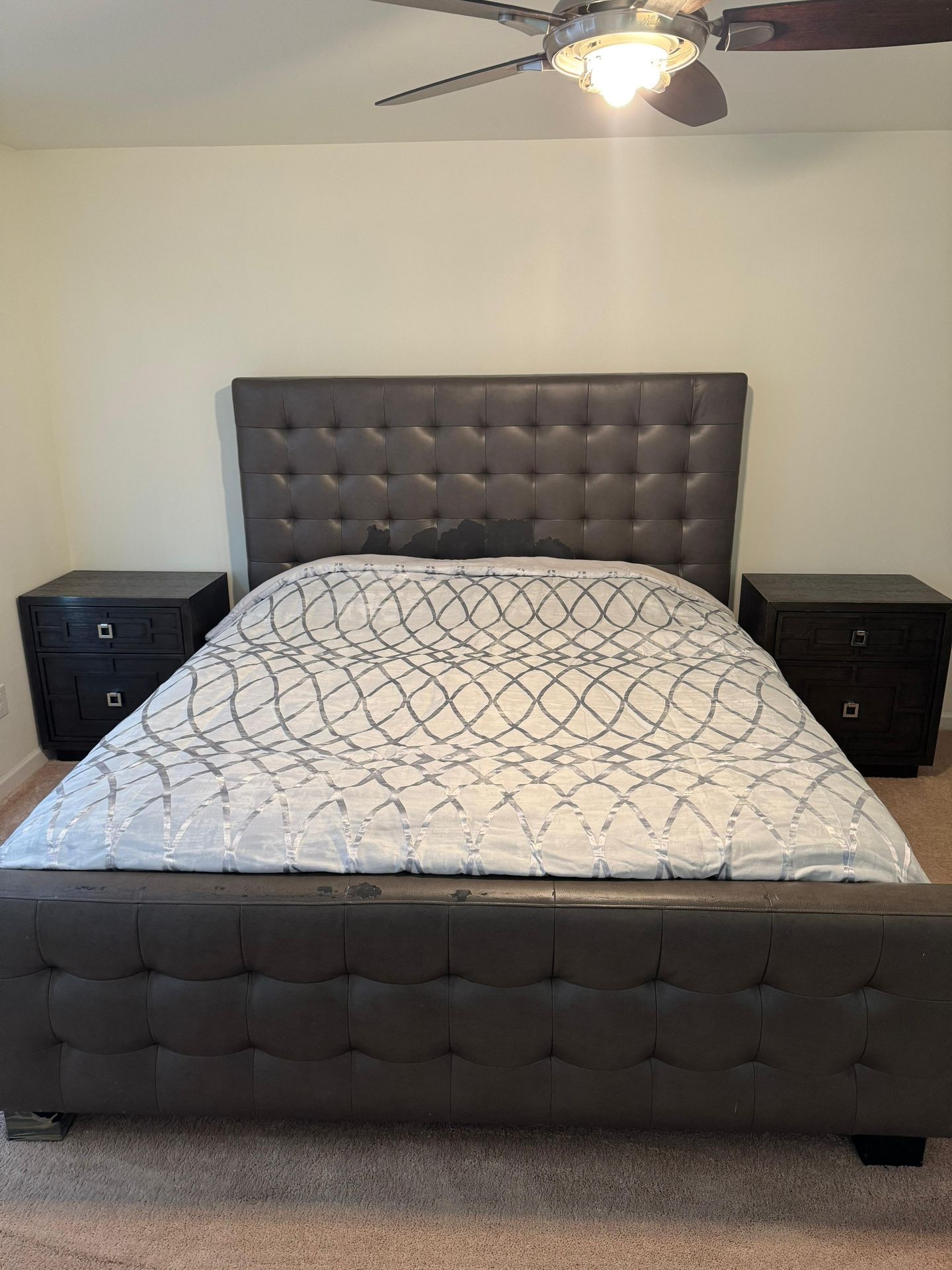 Z Gallerie bedroom set (charcoal) that includes king size bed, dresser, and two night stands. There is some tear by the headboard/front (leather tear/wear) and dresser. It’s an 8-year old bedroom set, was purchased brand new. Reason for selling, is because I am moving out of state. Text for details.
