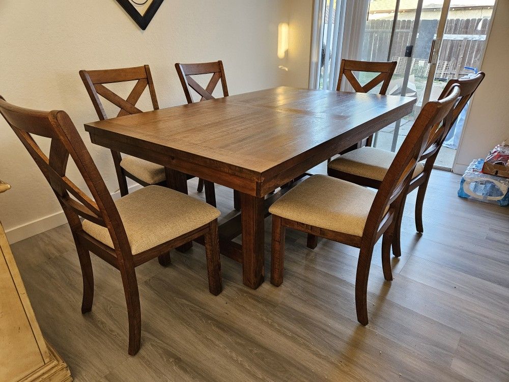 Brand New 7 Pcs Dining Set Table & 6 Chairs Brown Solid Wood W/ Fabric Cushions $649 + Tax FREE LOCAL DELIVERY & SET UP FINANCING AVAILABLE 3 MONTHS SAME AS CASH NEW LOCATION YUCAIPA