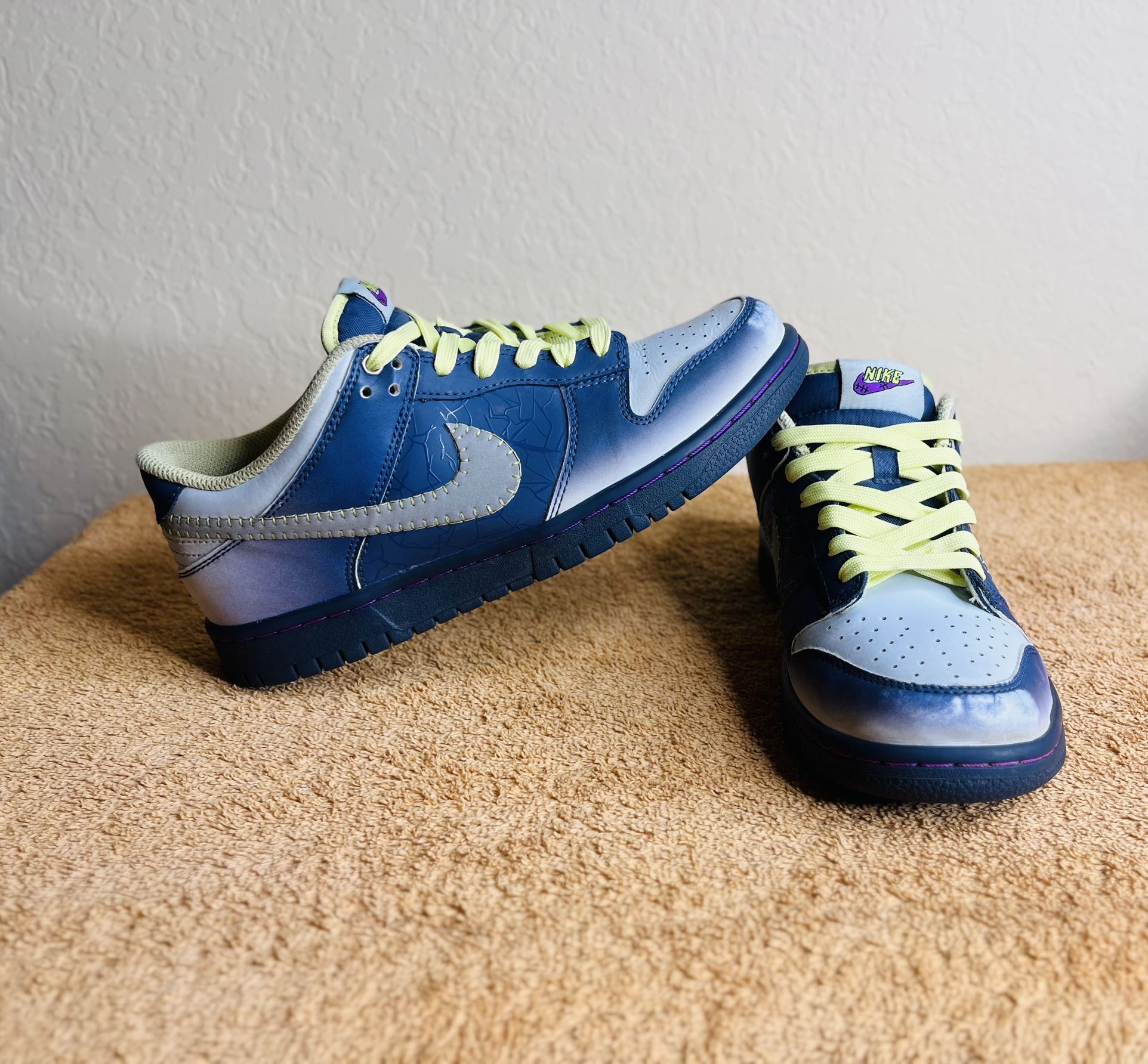 The Nike Dunk Low Halloween Shoes Youth 6Y are a stylish and limited edition pair of sneakers designed for skateboarding. Featuring a geometric pattern in blue color, these lace-up shoes are cushioned and made with leather upper material, providing comfort and durability for active boys. The retro streetwear theme and standard shoe width make them suitable for both casual and activewear occasions, perfect for young skaters looking to show off their fearless style on the board. Made by Nike, a trusted brand known for quality athletic footwear, these shoes are a must-have for any young skateboarding enthusiast.