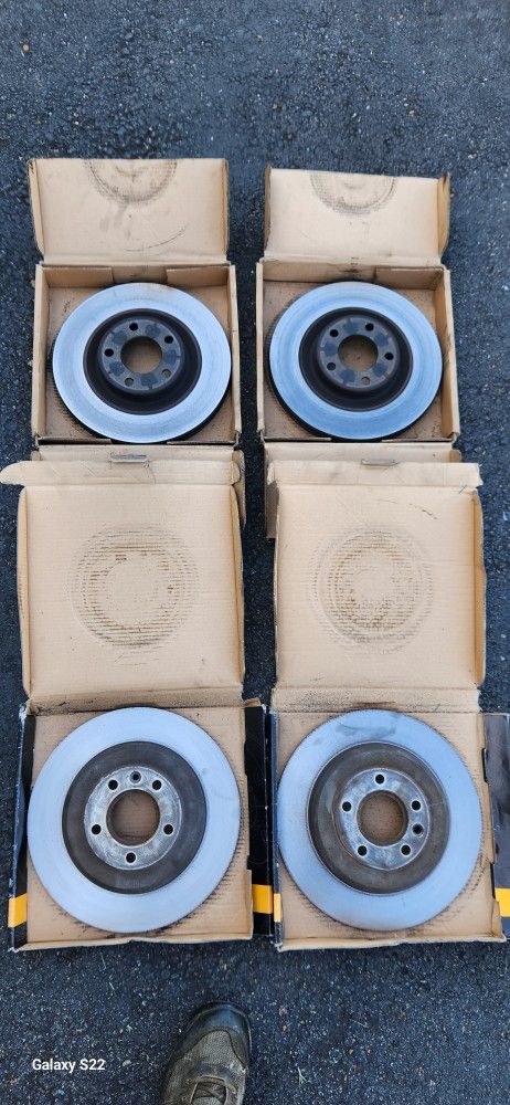 Complete set of four brake rotors from a 2011 Ford Edge. Two for the front, two for the rear. I kept a set standing by for brake jobs on my wife's car. I would have them machined and ready to install before I started the job. I would exchange the machined rotors for the ones being removed so I could get the job done the same day. The front rotors are warped and have not been machined. The rear rotors were machined in March 2024 by Olympic 4x4 in Snohomish and are ready to install. The engine in the car blew and we sold it to a retired mechanic. I forgot to send the rotors with the car. Price is for complete set of 4 and only covers my cost to have the two rear rotors machined last year. Free delivery within 10 miles of Everett WA (mainland only).