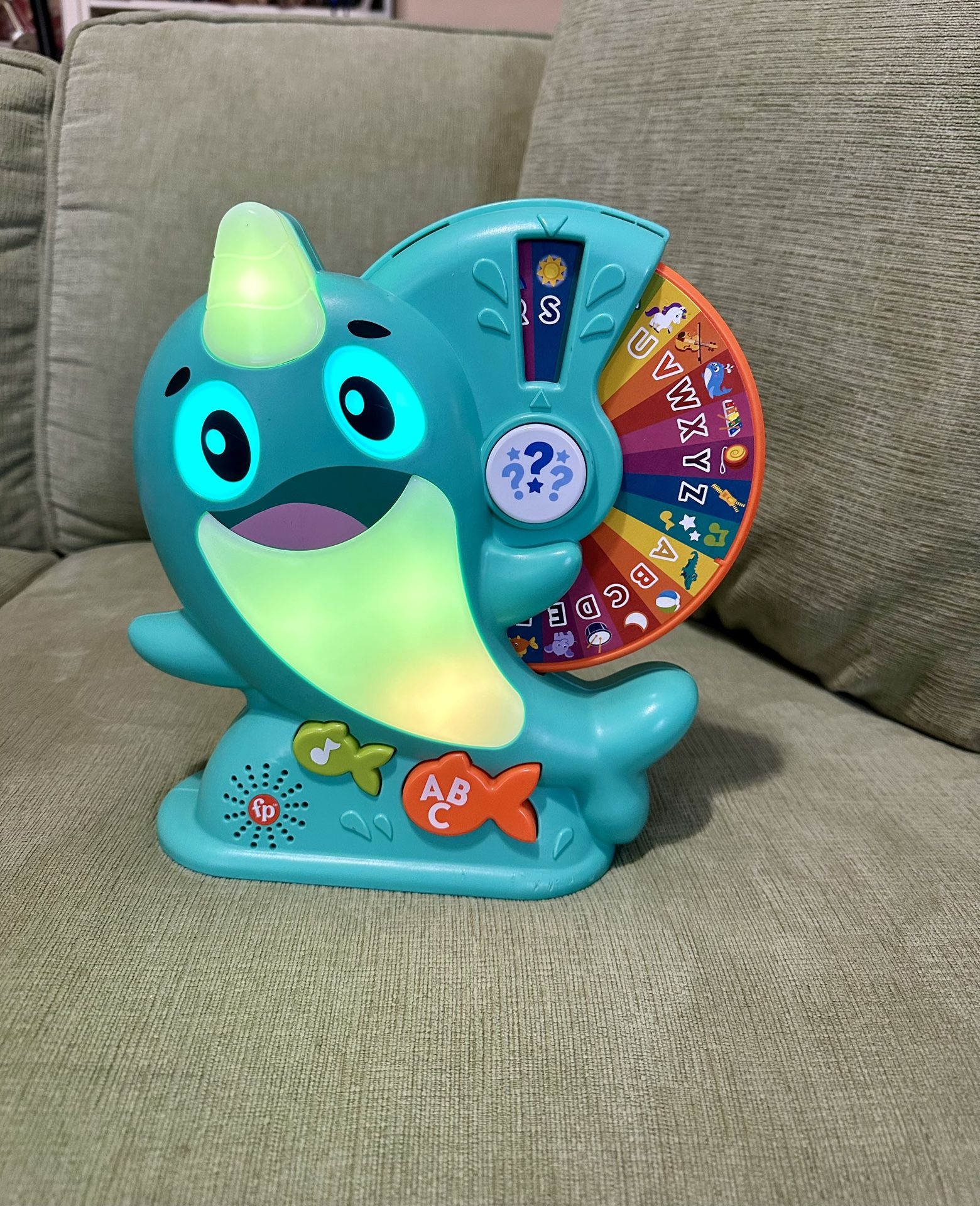 Linkimals Narwhal Baby Toy for babies/toddlers. Links up with other Linkimals (I have the koala too) & plays music, teaches the alphabet & numbers. Has fun quizzes too! My LO enjoyed this so much! In overall good condition, works great. Has a few nicks on the bottom & small pen marking at the back. Superficial cosmetic only that aren’t noticeable. Great if you’re adding to your linkimals collection or are looking for the sold out Narwhal!