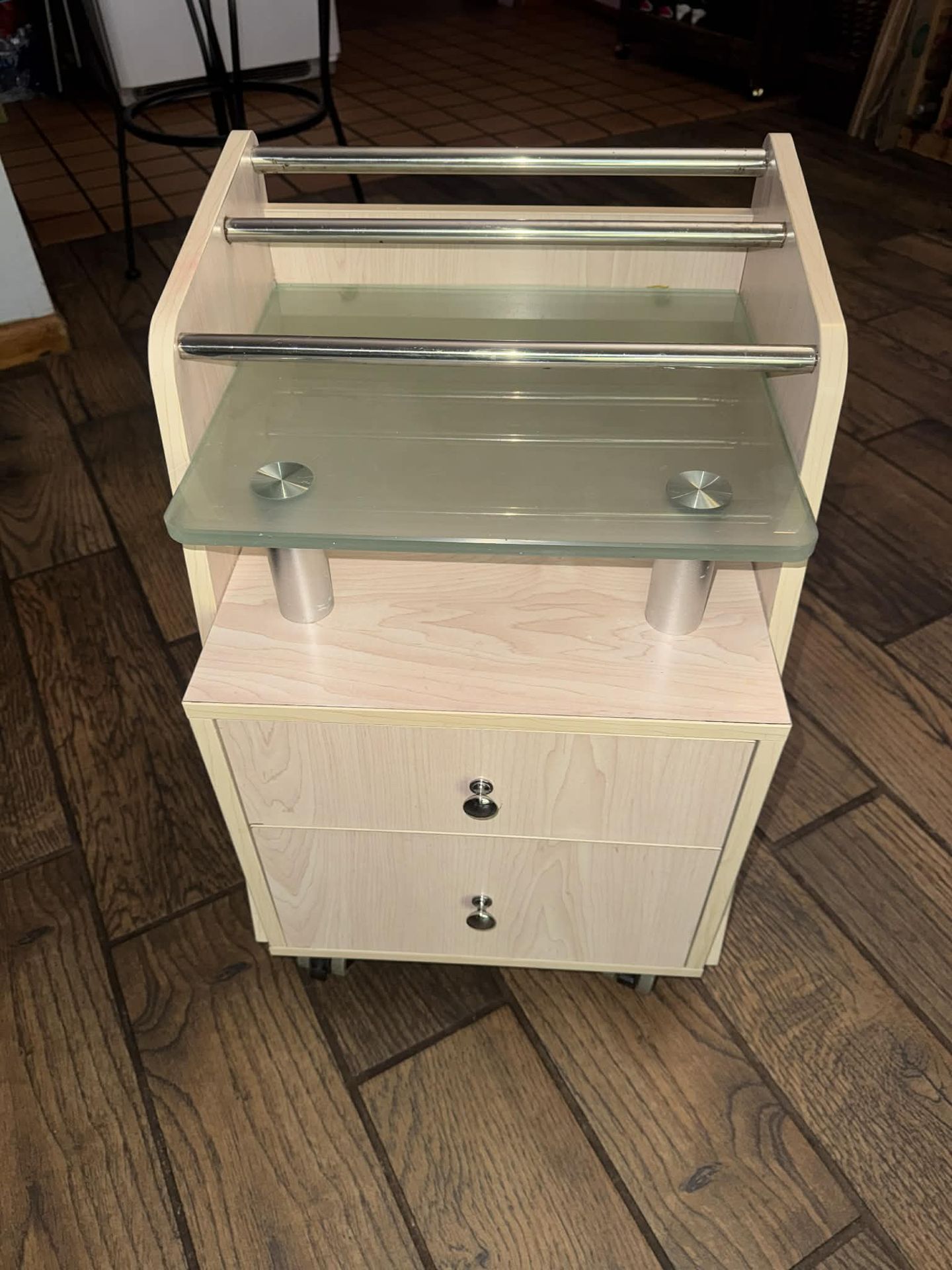 Great condition Retail $210 Bottle holding slots accommodates up to 3″ and 4.25″ diabottles on the glass top. Easy to clean tempered glass top shelf. Additional storage under the glass for small items. Spacious(2) drawers with easy glide tracks. Heavy duty swivel casters with lock.