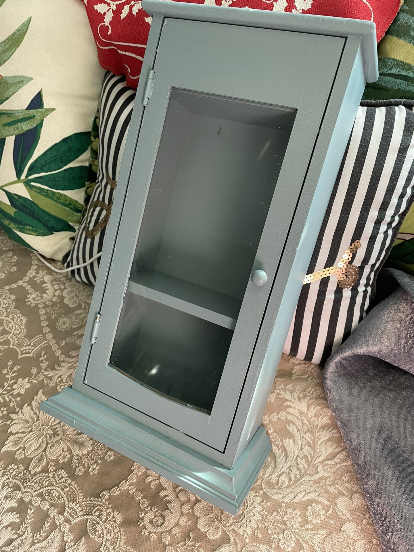 Wood vanity trinket holder with glass door - 13 3/4 inches high /. 6.5 inches wide / 4 inches deep