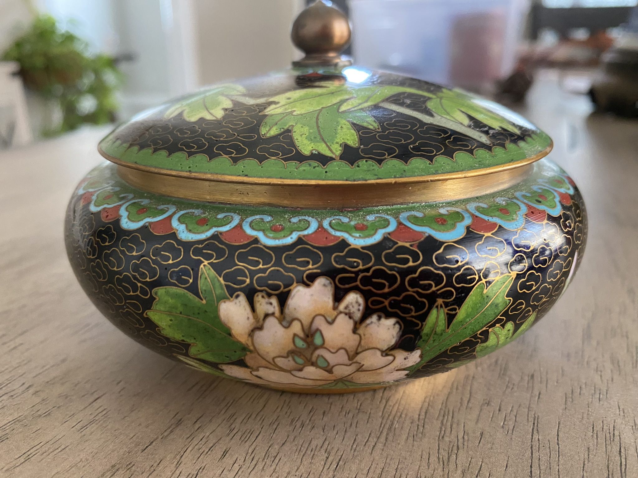 Vintage Chinese Cloisonne Enamel Bronze Floral Dahlia Decor Lidded Trinket Bowl