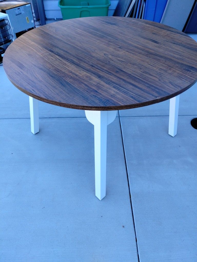 Selling new farmhouse round dining table. White base with faux brown wooden top. Has damage as shown In picture but fully assembled and fully functional still nice. Sells for over $100 online asking $50 Measures 47 inches around