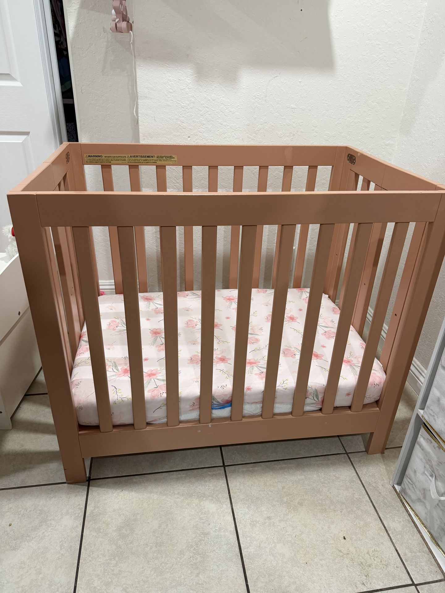 Mini crib with mattress and bed sheets