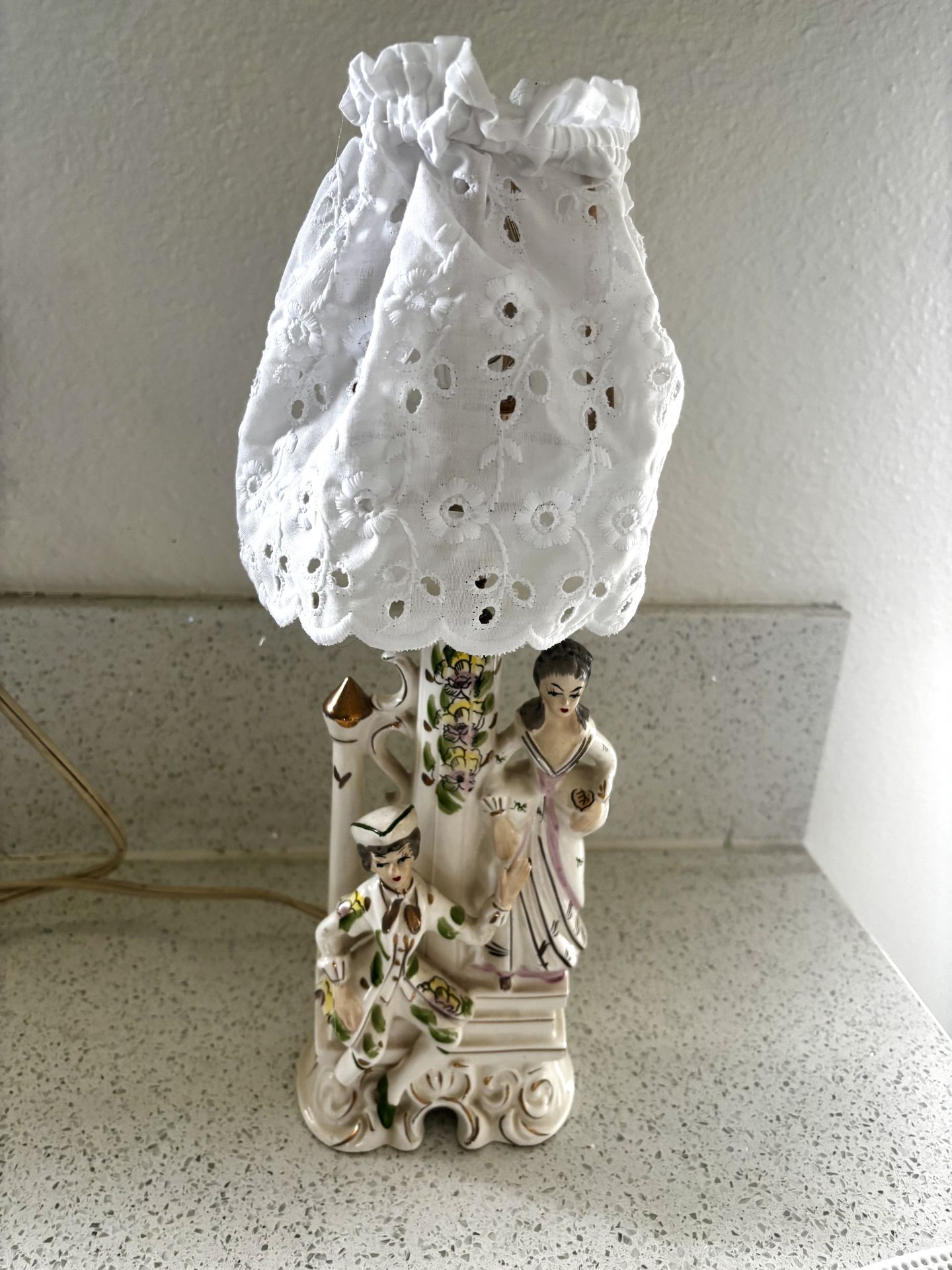 Adorable, small size vintage lamp with hand, painted details and gold trim. I added the lace shade. Works great, takes a nightlight size bulb. PLEASE NOTE! See the picture, the man is missing 1 of his feet! it is at the bottom and pretty unnoticeable. Cash preferred! I discount for multiple purchases! Check my other listings.