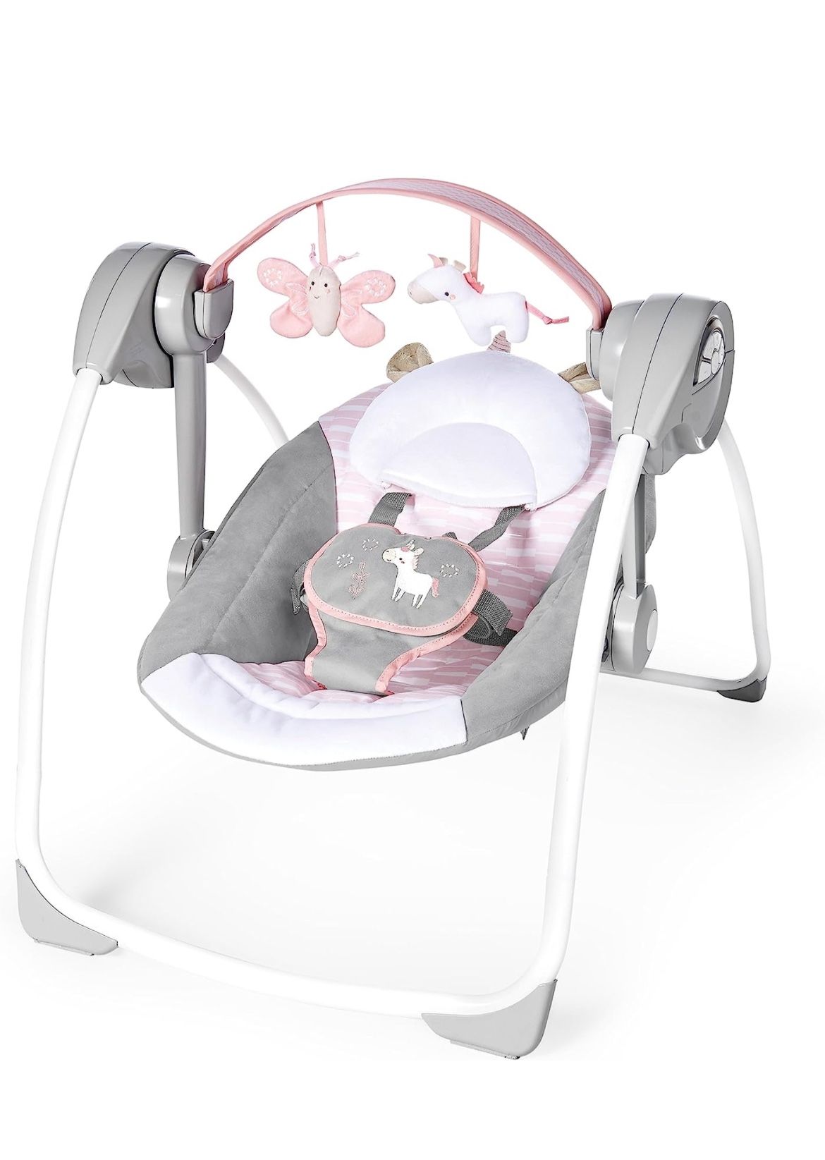 Ingenuity Comfort 2 Go Compact Portable 6-Speed Cushioned Baby Swing with Music, Folds Easy, (Pink Flora the Unicorn)