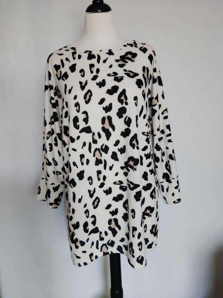 A comfy knit 3/4 sleeve tunic top, cream color animal print, size large. Material tag is missing, the fabric feels like light weight sweater fabric. Great pre-owned condition, please view all photos listed which include measurements. Thanks for looking and be sure to check out my other listings for more clothing and other great items!