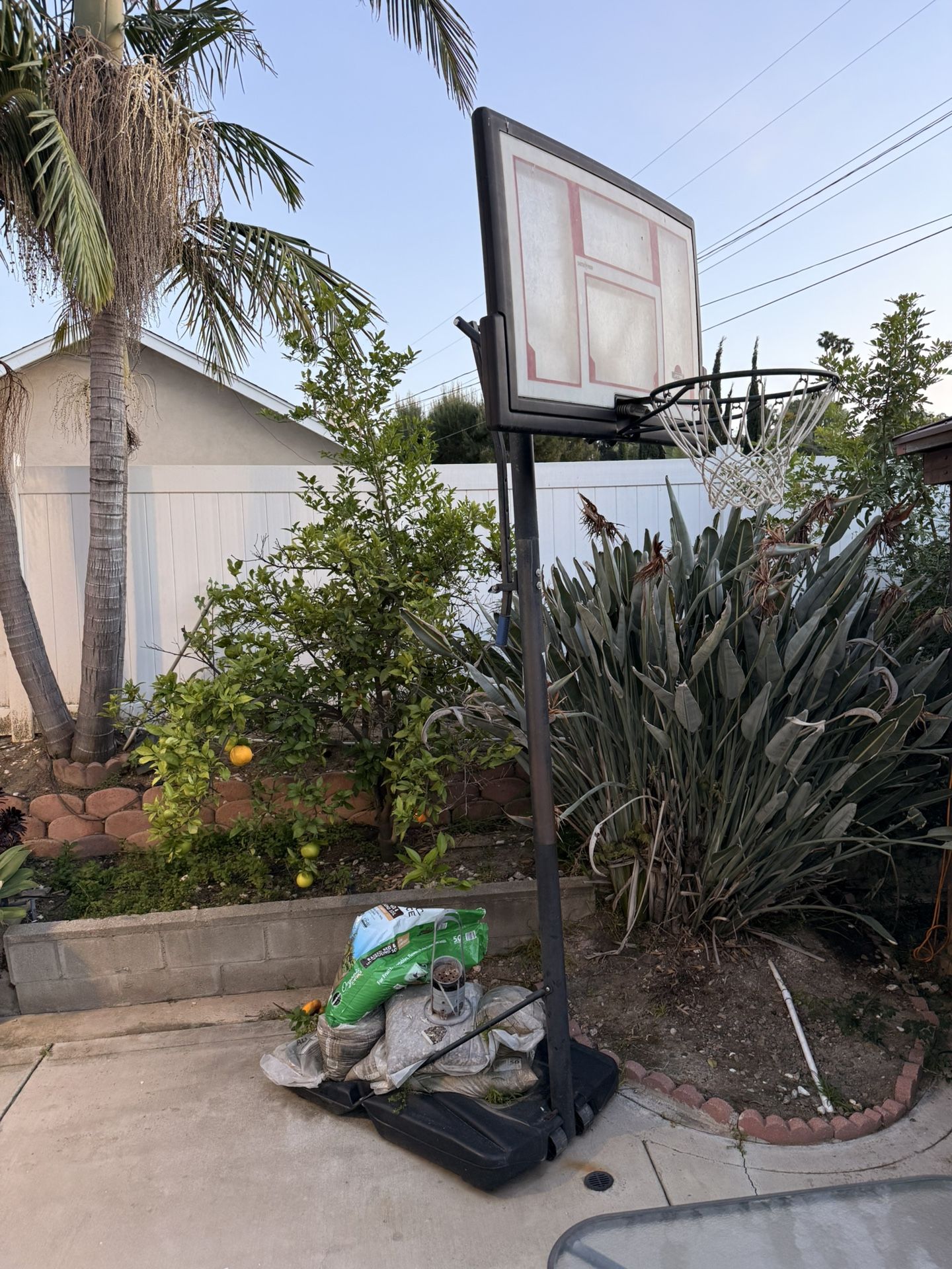 Adjustable Basketball hoop Free First come first serve It’s in the backyard so you have to be able to move it to your car and carry it out. (I can help if I’m there) Not disassembled, bring your own tools if you need to take it apart, Does not come with weight to keep it up.