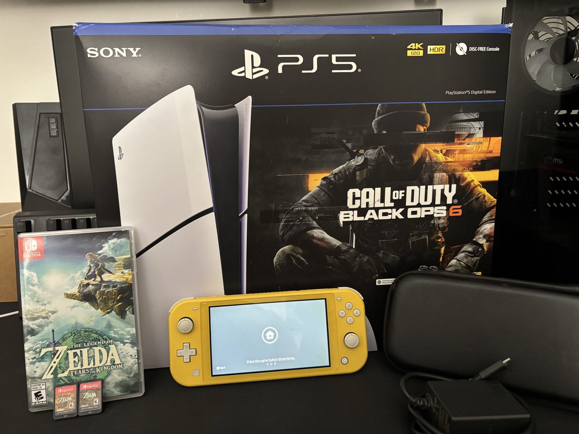 Selling a PlayStation 5 Digital Edition (Call of Duty Black Ops 6 bundle) and a Nintendo Switch Lite (yellow). Includes: -PS5 Digital Edition with controller & cables - Nintendo Switch Lite (yellow) - The Legend of Zelda: Tears of the Kingdom (with case) - Charger and case included Everything works perfectly, no issues. Selling because I don't use them anymore. Message me if interested!