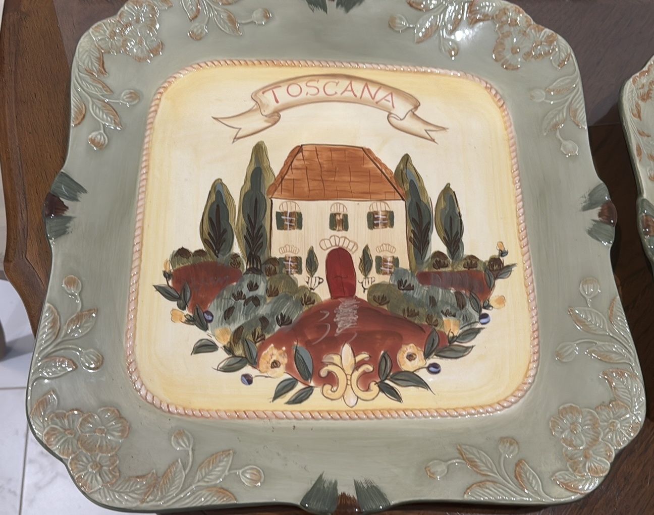 This piece is part of the Toscana collection by Certified International. Looks beautiful hanging on wall, standing on pedestal or entertaining server. In good as new condition, to cracks, chips, etc. It was a gift. I don’t entertain & have downsized home. DISCOUNT: Buy both 13” & 16” platters for $40 OBO
