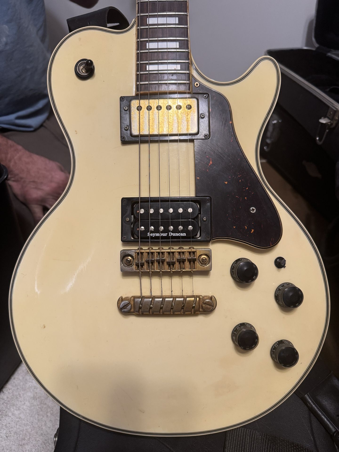 This is a very nice it’s considered the color white but with age it becomes more like a yellow cream colored. It is from 1978 made in Japan, Ibanez Guitar. It has one humbucker that is not original but as far as I can tell, everything else is original very nice piece