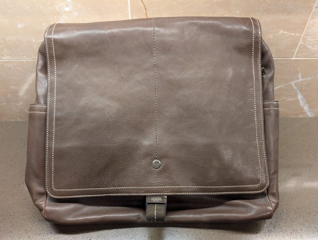 This is a Coach Brown Crossbody Messenger Bag featured in a soft brown leather and silver hardware throughout with the following features: * Front has a Clasp Buckle Closure * Front Main Compartment features: * Large zippered side pocket * Large Pocket with tabs to hold pens * Medium Pocket * Small Pocket * Large Bag Pocket Area with magnetic closure and zippered pocket inside * Two Side deep pockets * Adjustable shoulder strap It measures approximately 13" tall x 16" wide x 3.5" deep and is in EXCELLENT-NEW condition with no stains, rips or damages. Located on the west side. Please click on my name to see other items I've posted