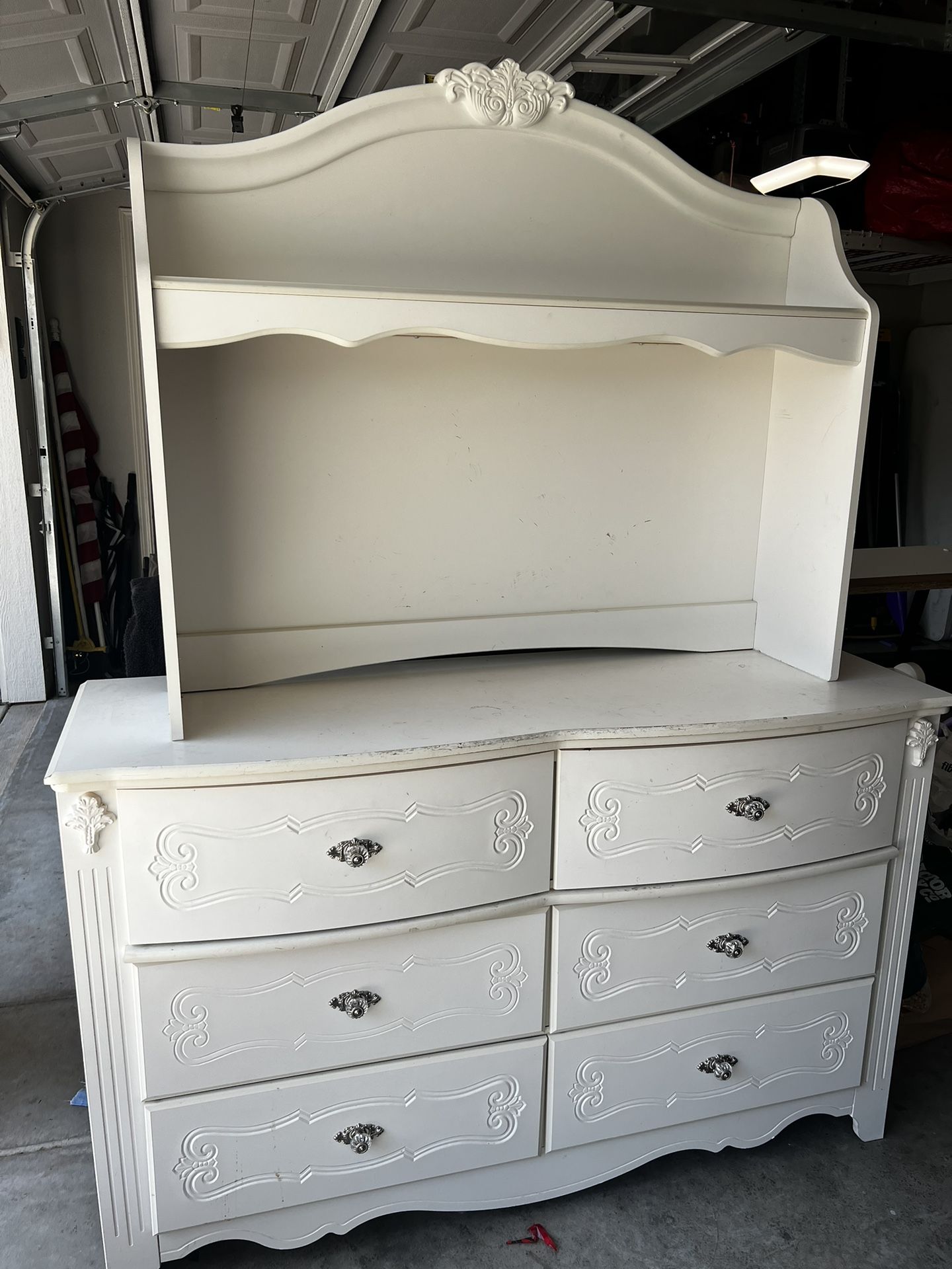 Non smoking, non pets, gently used in child’s room. Some pieces need touch up paint. All hardware, fully functioning drawers, knobs, etc.. Dresser dimensions: - 16 3/4 inches wide - 36 inches tall - 55 3/4 inches long Pickup this weekend. Mike