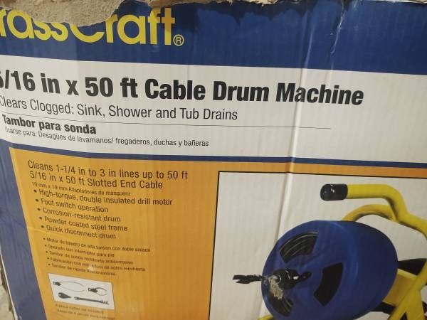 NEW BRASSCRAFT 5/16 in. x 50 ft. Cable Drum Machine Plumber Snake Brand new in box, opened for inspection and testing only! Includes all accessories! Clear sinks, showers and tub drains with the BrassCraft 5/16 in. x 50 ft. Cable Drum Machine. Designed to clear clogs in 3/4 in. - 3 in. diameter pipes up to 50 ft. deep. This versatile tool is powered by a high-torque, fixed-speed drill motor and can be operated hands-free, thanks to its convenient pneumatic foot switch.
