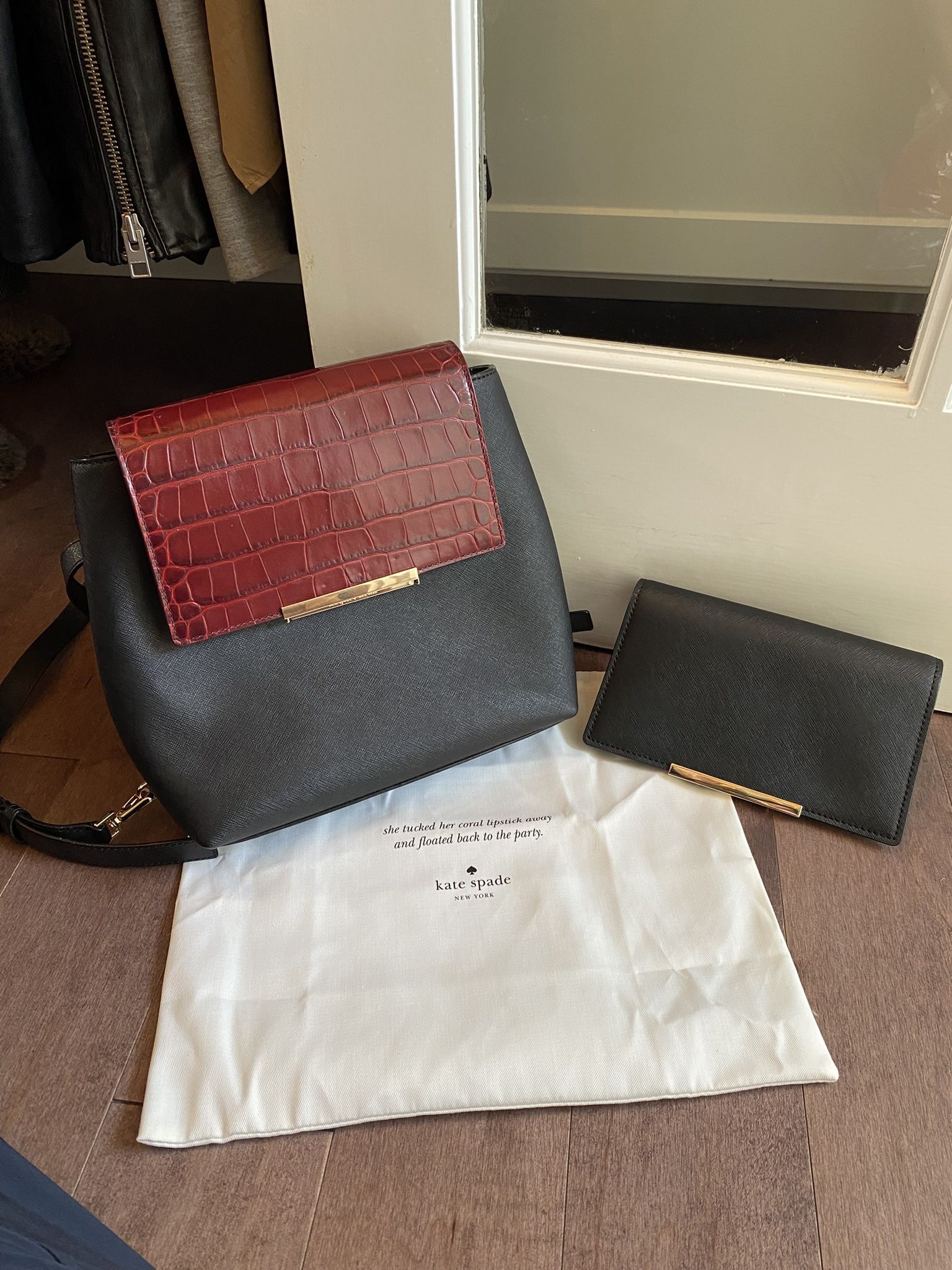 Kate Spade New York Make It Mine Small Maddie black leather convertible backpack with a red crocodile-embossed flap able to switch to black flap