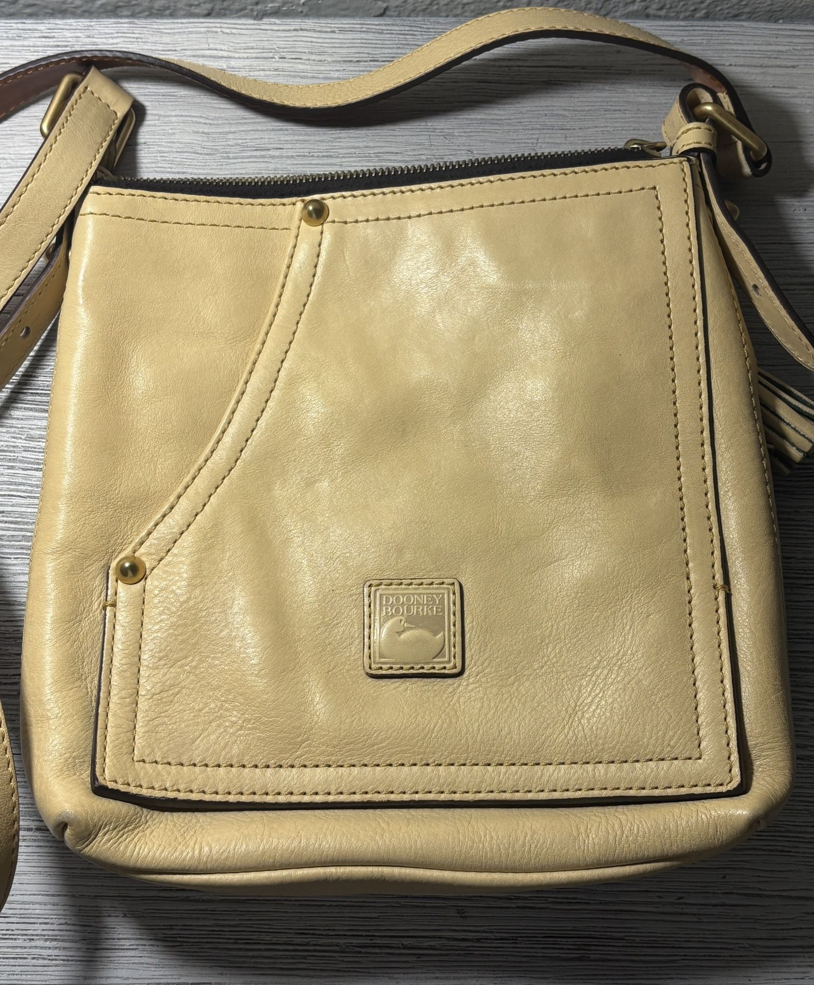 AUTHENTIC Dooney & Bourke letter carrier crossbody bag in a light tan or bone-colored leather with an exterior pocket and golden hardware. Accepting offers! Shipping or Local Meets!