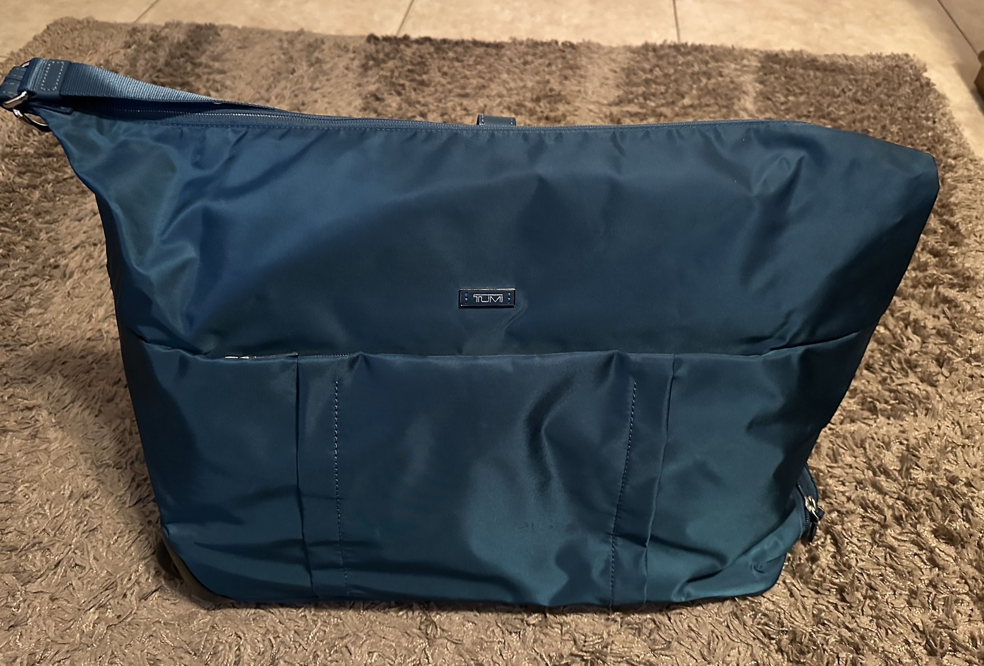 Authentic Tumi Wheeled Duffle - Nylon with Leather Accents - Duffle has a convertible shoulder strap, two exterior pockets, interior zipped pocket, and two open pockets. Duffle fits nicely in overhead, soft nylon material is water resistant. Lots of pockets for storage - sized generously. Leather luggage tag and Tumi lock. Turquoise nylon with tan lining. Beautiful bag in excellent condition. Priced to sell at $75. (67th Ave & 101)