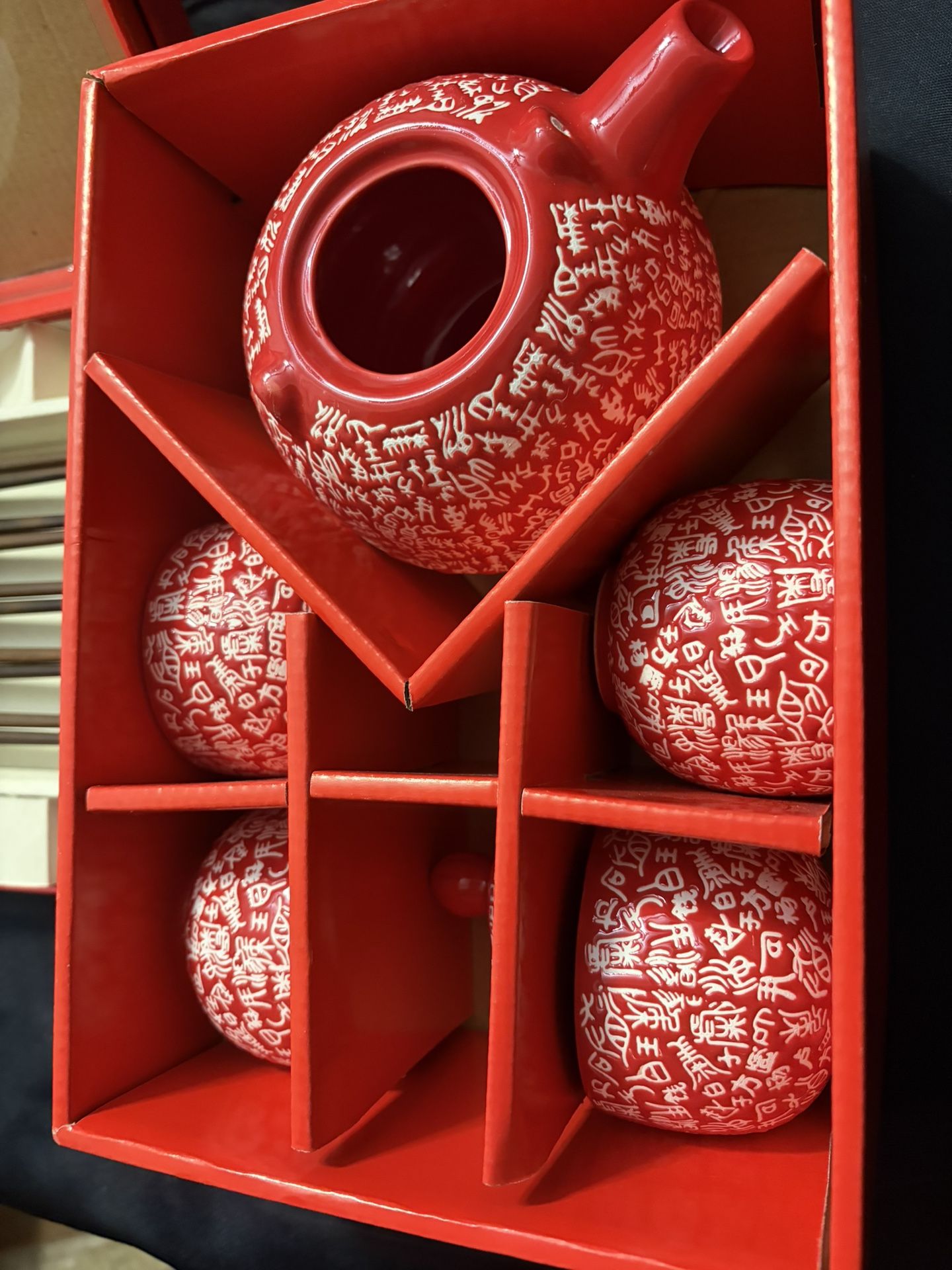 Brand new never used red teapot with four tea cups