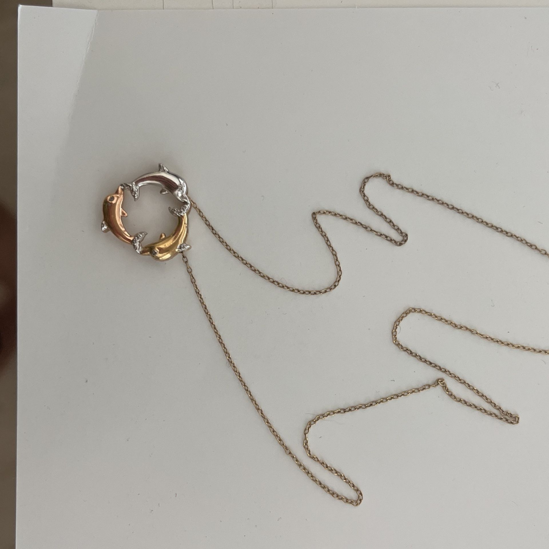 gold, silver, and rose gold dolphin necklace on gold 20” chain.