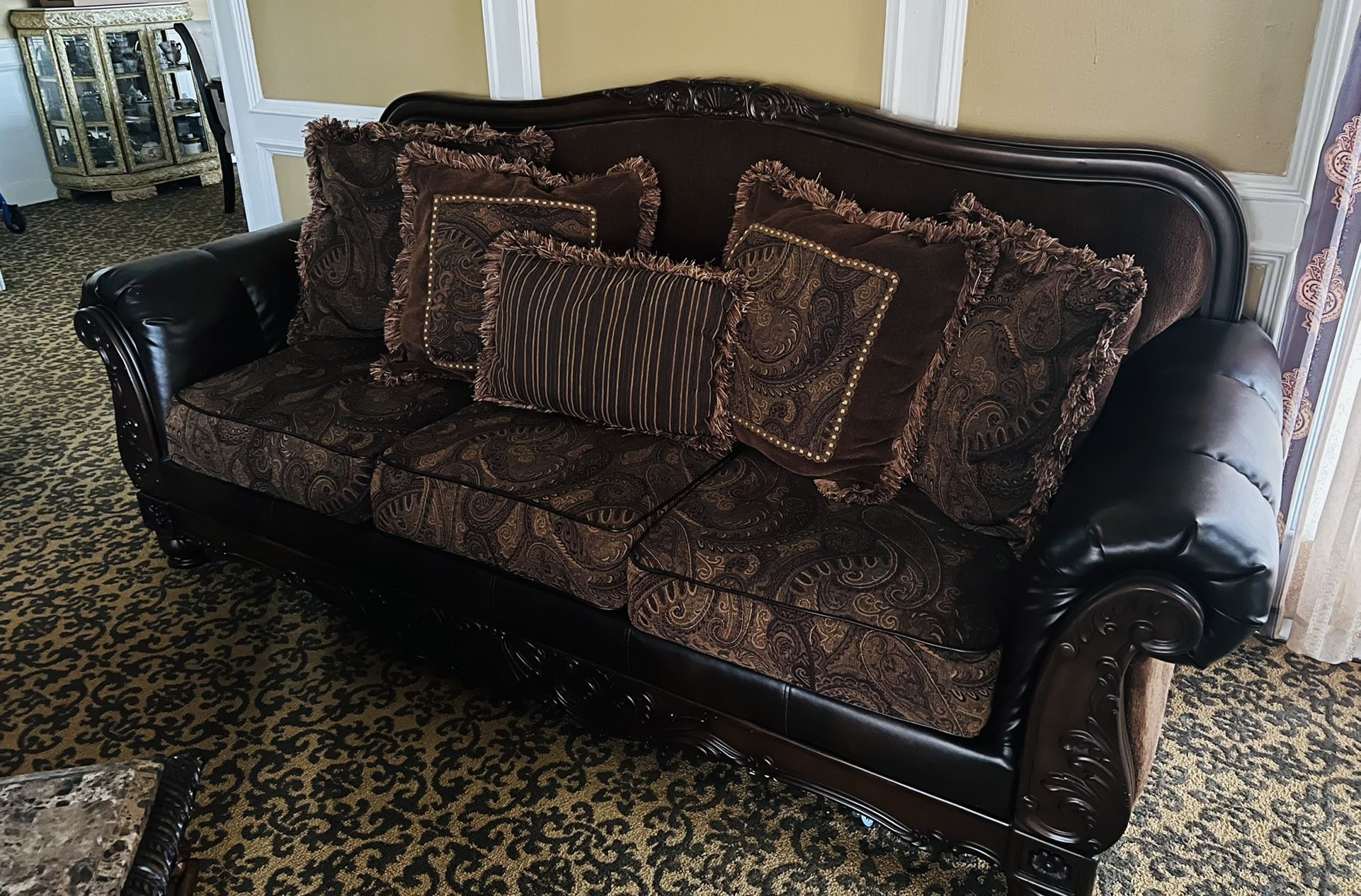 One year old Ashley‘s furniture set moving sale everything is still like brand new moving moving bundle! Curtains lamps tables chairs all included! Color brown Couches Curtains Lamps Mirror Sofa Love seat Accent chair Moving sale everything must go