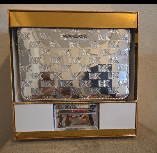 MICHAEL KORS Jet Set Large East West Crossbody & Card Holder Gift Box Silver New Never Used