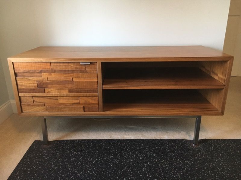 Room and Board Innes Media Cabinet in Walnut Color with Stainless Steel legs and Aluminum Hardware. 52w x 20d x24h, one door media cabinet in excellent condition. Used for 1 year. Retails for $1499. Description from Room and Board Website... Innes adds character to your storage. Solid walnut wood is layered to create a three-dimensional texture on the door fronts. Built by North Dakota woodworkers of high-quality U.S. and imported materials, each Innes cabinet is as durable as it is distinctive, with your choice of a natural or stainless steel base.