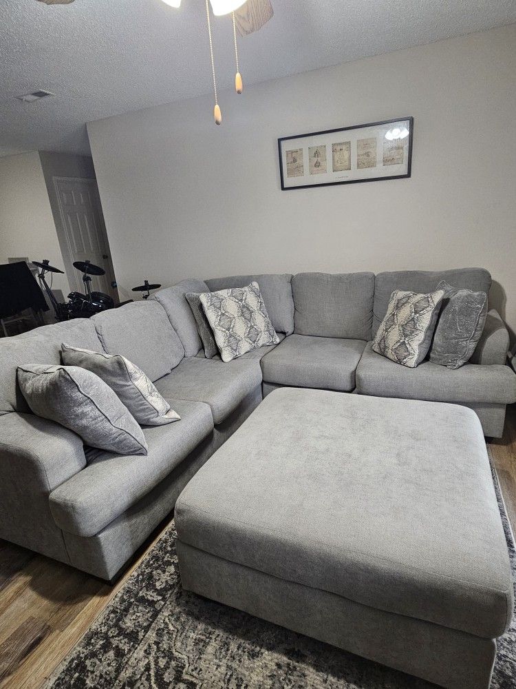 Light gray sectional w/ pillows and ottoman. Good condition. Originally purchased from Ashley Furniture. Size: 86" length × 36" height × 39" wide.