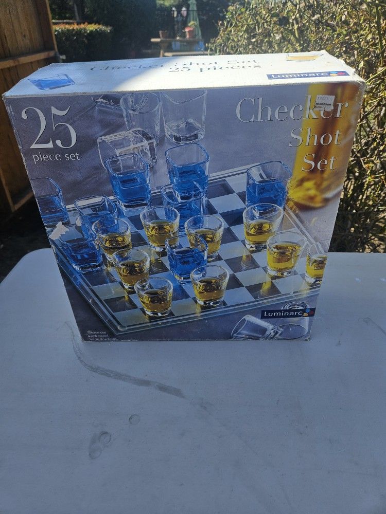 Great white elephant gift. Has 12 shot glasses and a glass checker board. $10 or best offer