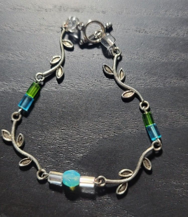 Handmade Bracelet In Blue And Green beads that remind me of sea glass. These are complimented by a metal Vine designed bead. There is a matching necklace for $10, and earrings for$5