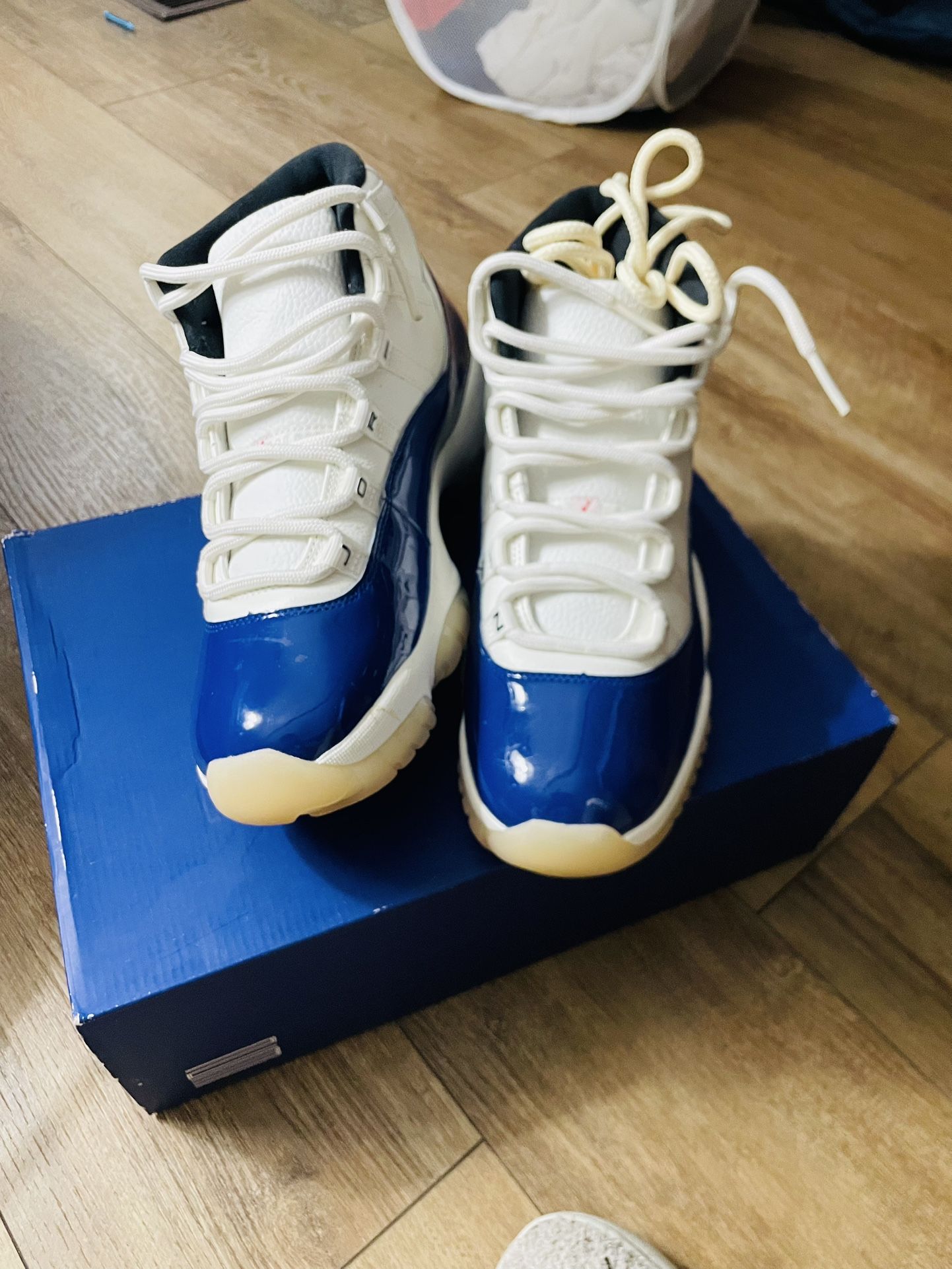Jordan 11 rare air 10.5 Worn twice comes with original and white laces and original box. The Air Jordan 11 Retro Rare Air (2025) returns with subtle swagger and bold heritage. Dressed in deep royal blue, fire red, sail, black and muslin, the standout feature is the high-shine patent leather mudguard in the royal blue hue, a signal that this isn’t just another run of the AJ11. Classic white leather above gives it that clean contrast while fire red hits and a muslin-tinted translucent outsole add vintage flavor.