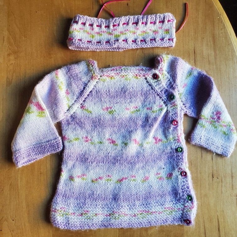 Hand-knit Sweater & Matching Headband Approx. 6-9 months? Maybe upper side of 3-6? Measures 12.5 inches long from shoulder to hem and sleeve is 6.5 inches from pit to cuff. Baby Girl Purple & pink Feels like acrylic yarn Super soft Lightweight knit Button closure up side Perfect for anytime, but would be especially cute in spring or for Easter Great used condition, only worn a handful of times and maybe laundered twice. Smoke-free home