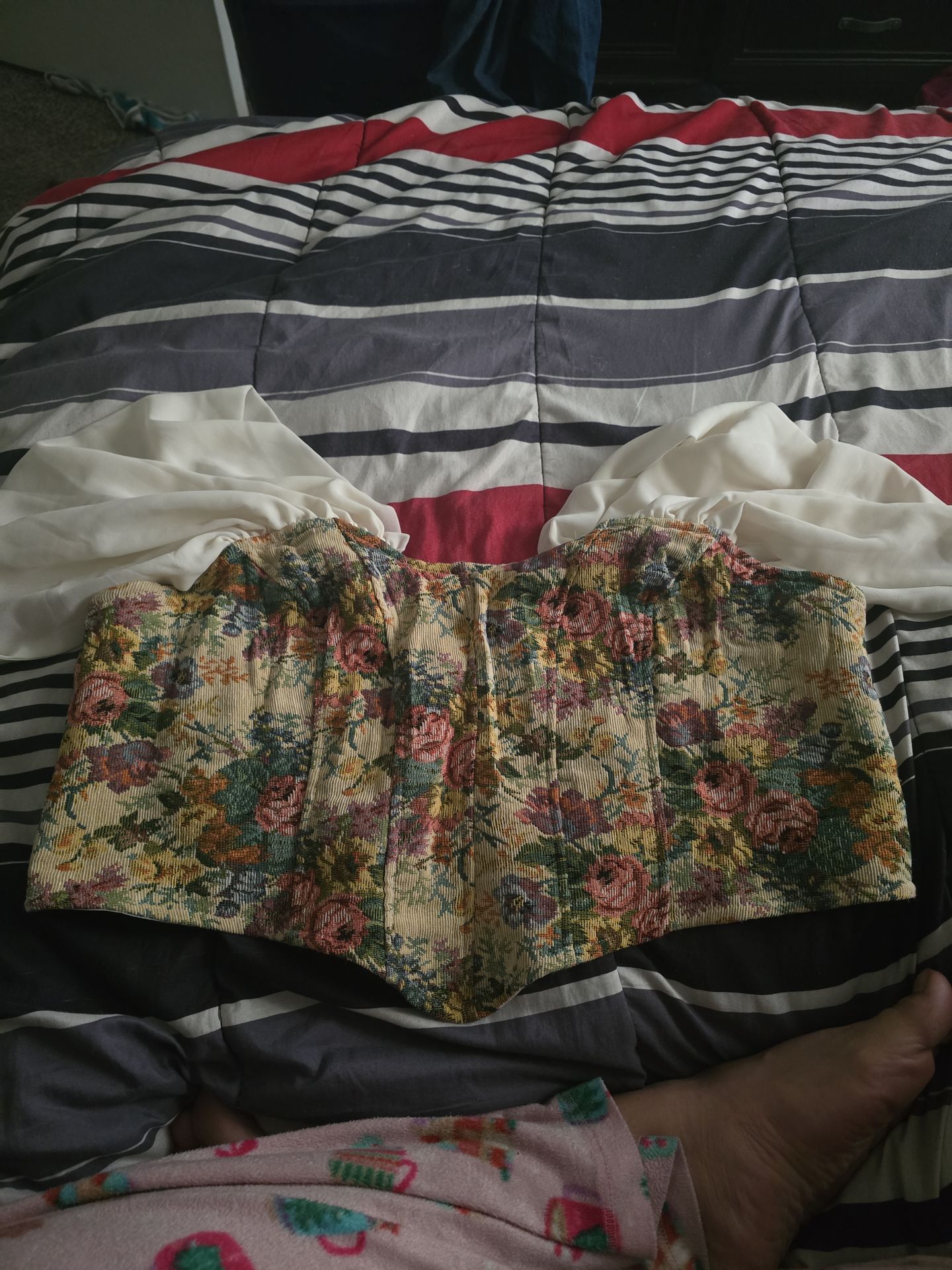 Vintage-floral style corset crop top with zipper. Very little stretch Off-shoulder silk sleeves