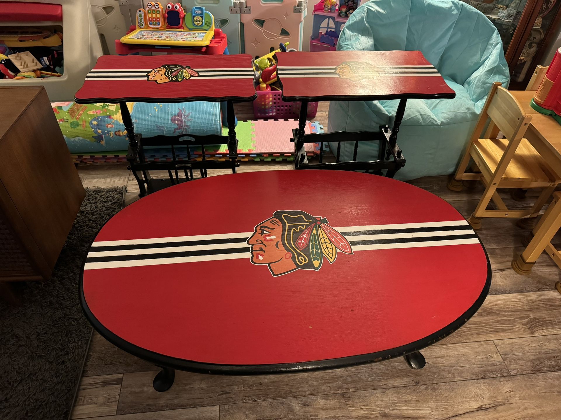 Chicago Blackhawks Coffee Table and 2 Side End Tables $200 For The Set $150 For Coffee Table Alone $100 For 2 Side / End Tables $200 Deal For All 3 Carol Stream Pickup No Holds