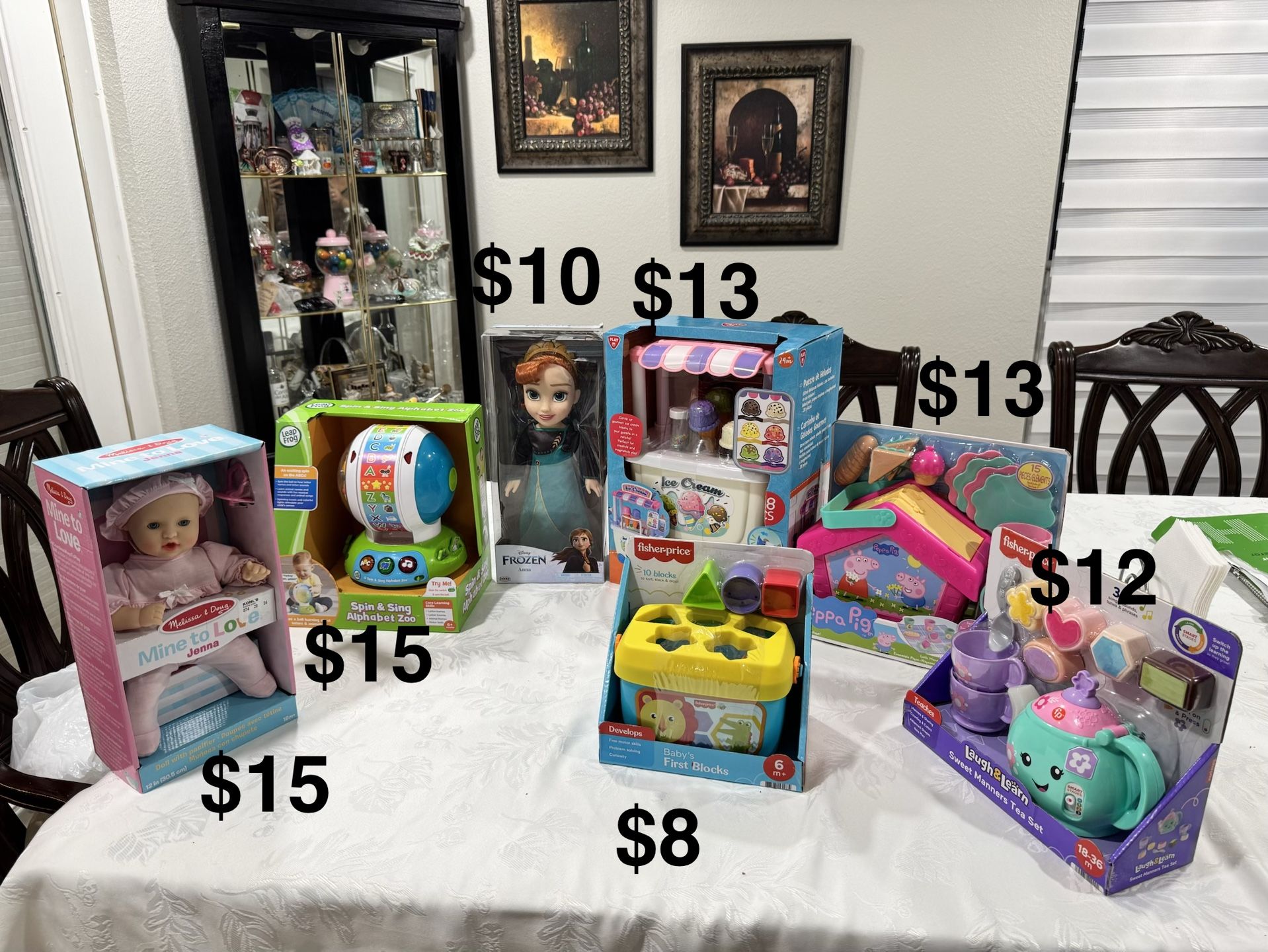 Brand new toys, NEVER OPENED. prices for each toy display in picture. If you want all you can have them for $65or Make me an offer