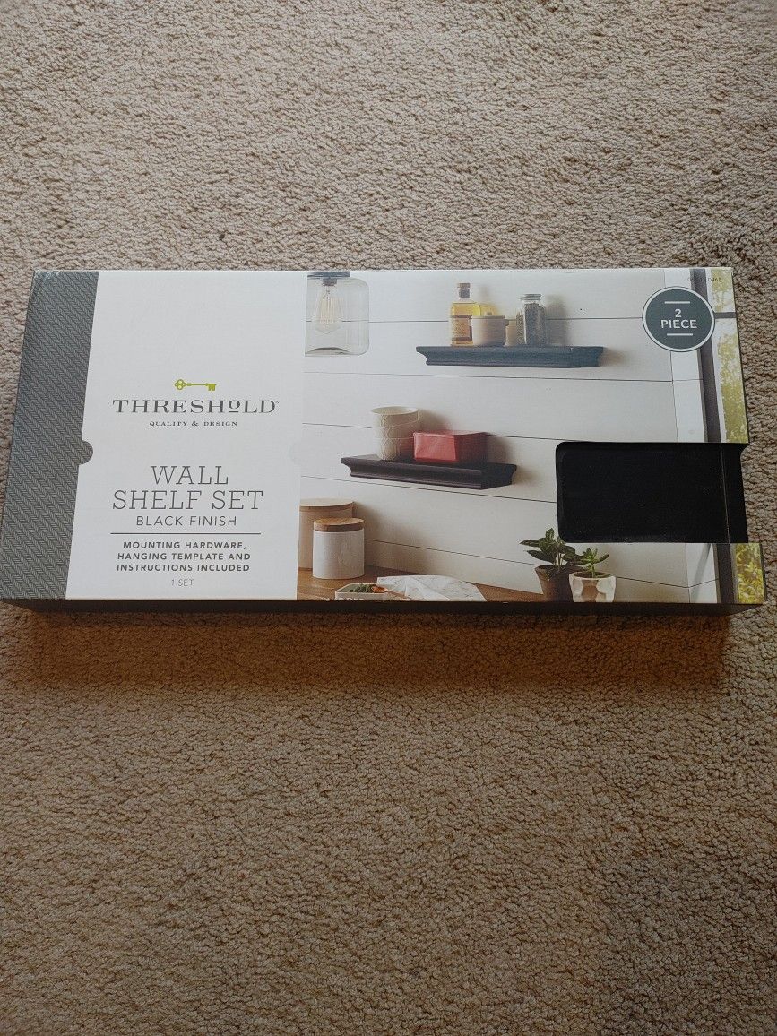 Threshold. 2 Black wall shelf's. 15 3/4 long 4 inches w and 1 3/4 high. New in box. Comes from smoke and pet free home. $13.00 now.