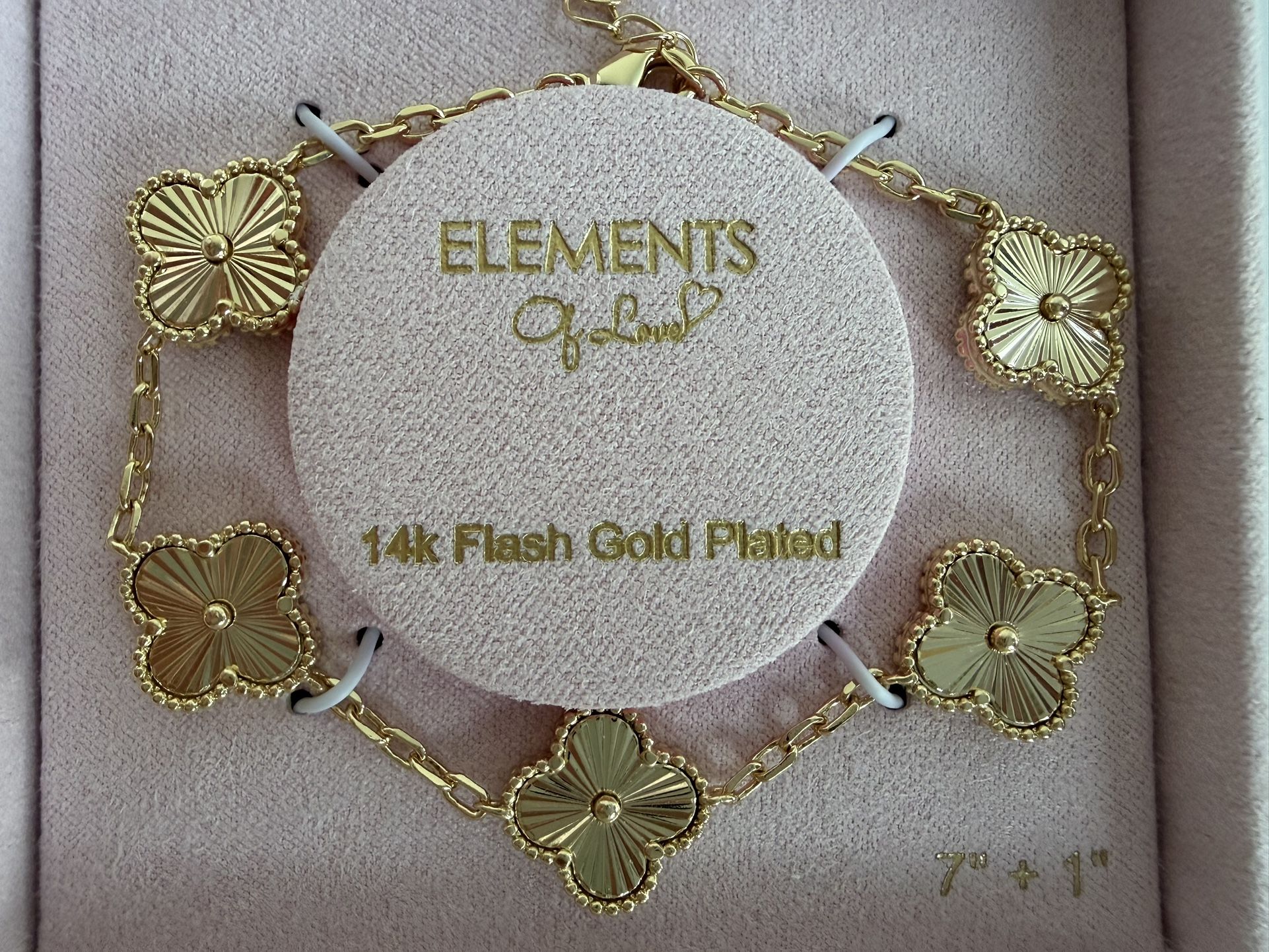 Elegant and timeless, this 14K flash gold plated bracelet features delicate clover charms that symbolize luck and beauty. Its polished shine and refined details make it perfect for everyday wear or special occasions. Adjustable length: 7” + 1” extender for a comfortable fit. A chic statement piece and a thoughtful gift for someone special. ✨