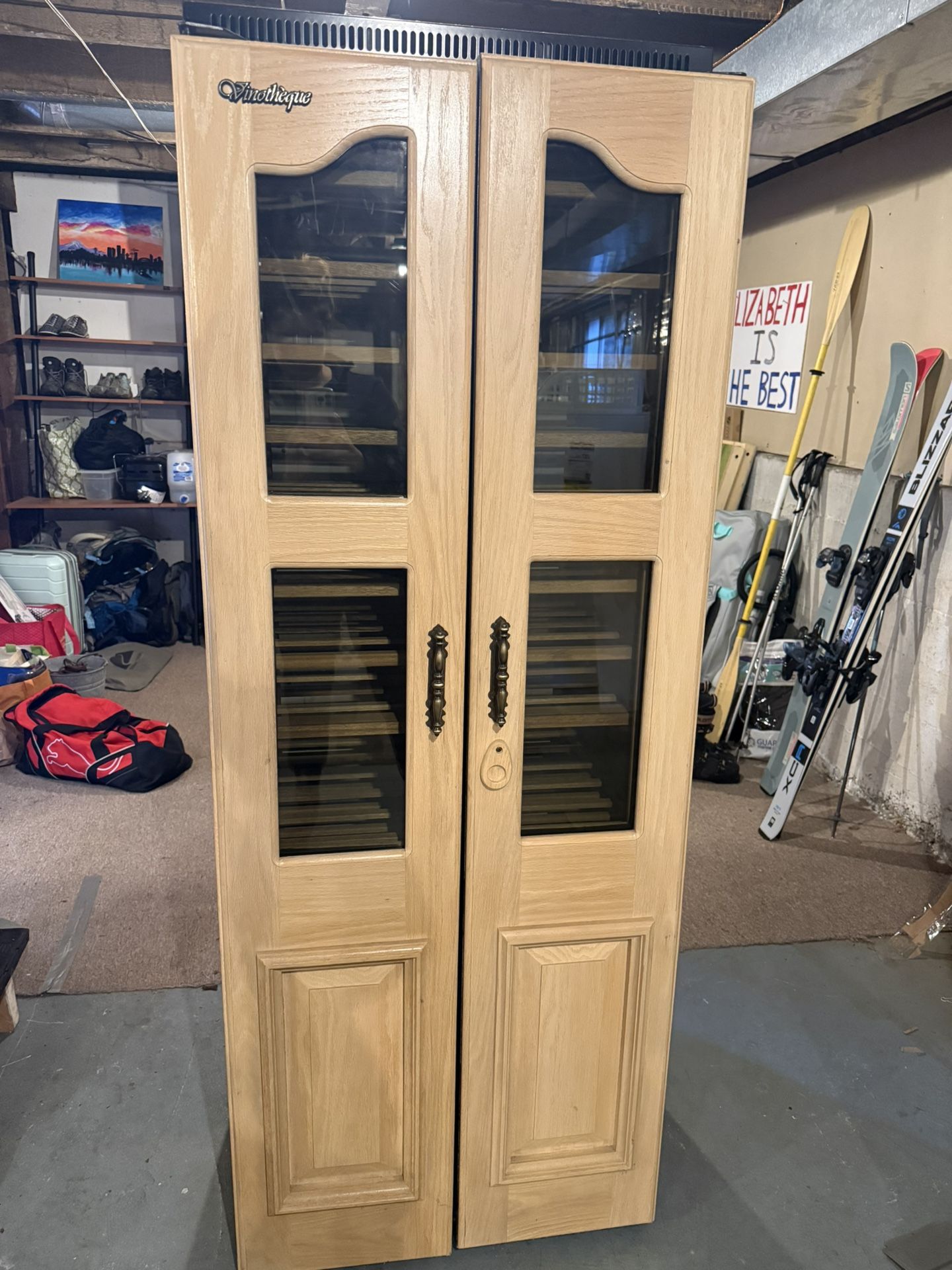 Vinotheque brand wine fridge. Perfect working condition. 13 removable shelves, two doors, wood finished exterior 26.5” wide, 26.25” deep, and 71” tall