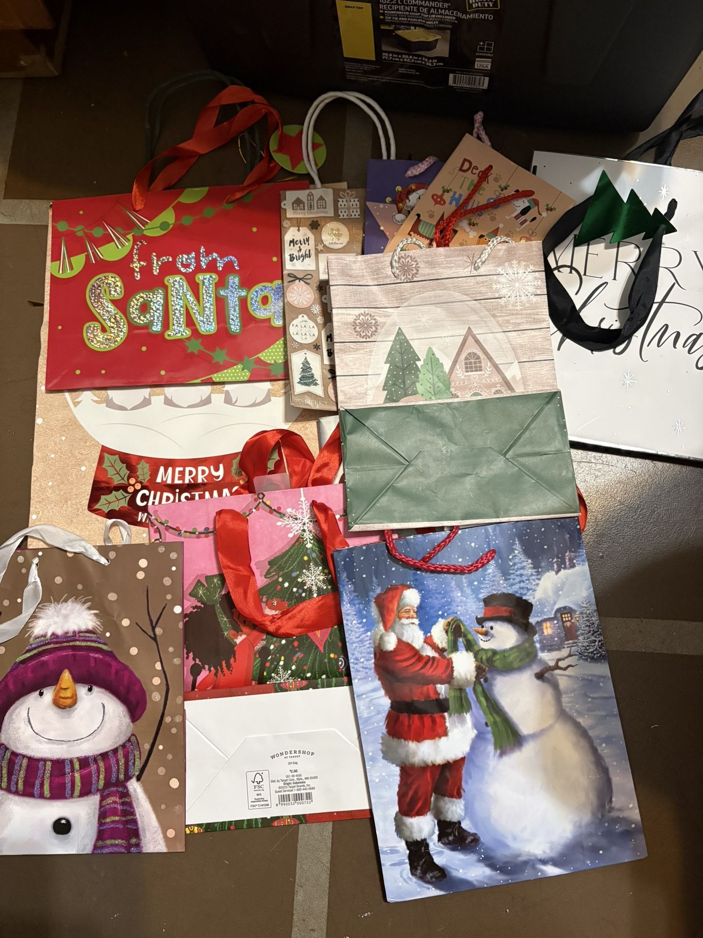 Different size Christmas bags used 1once 2 different size length lights the smallest one bought with a messing from an employee testing it 2 box of ornament’s hooks 2 rolls of stickers 2 different of blank cards had to take out of boxes 3 different wrapping tags 1 head peace of antlers Two plank different stockings SELLING AS HOLE NO SEPARATION