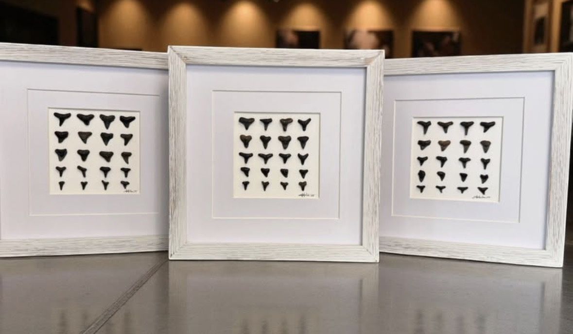 "The Final Bite" – A Fossilized Tribute to Oceanic Power Handpicked from the sun-soaked shores of Florida, "The Final Bite" is a striking triptych featuring a curated collection of 60 genuine fossilized shark teeth. Each of the three 9" x 9" frames showcases 20 unique teeth, meticulously arranged and artistically captured to honor the raw beauty and primal force of the ocean’s most legendary predators. This limited set includes fossil specimens from a range of iconic shark species - Great White, Sand Tiger, Tiger Shark, Lemon Shark and Hammerhead. Each tooth a relic of deep time and survival. From serrated edges to sleek curves, these natural artifacts reflect millions of years of evolutionary design. Each piece in the set is personally signed by the artist, offering not just a window into the past, but a deeply personal connection to the work. Together, the three images form a powerful narrative - one of nature, motion, and the lingering presence of the apex hunter. Perfect for collectors, ocean lovers, or those drawn to the intersection of science and art, "The Final Bite" is both a visual statement and a fossilized story told in tooth and shadow.
